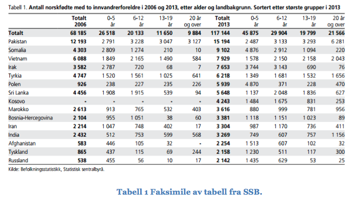 Det kan være at vi ikke skal la oss overraske av dette, men det forklarer ikke hvorfor noen grupper etterkommere, altså norskfødte med innvandrerforeldre, følger et negativt mønster. SSB viser til at gruppen er såpass liten (etterkommerne er forholdsvis ung som gruppe), og at tallene dermed blir usikre. Men denne gruppen vokser. I 2006 var nær 10 000 etterkommere over 20 år, i 2013 var det over dobbelt så mange, se faksimile av tabell under fra SSB, sortert etter de største gruppene i 2013.