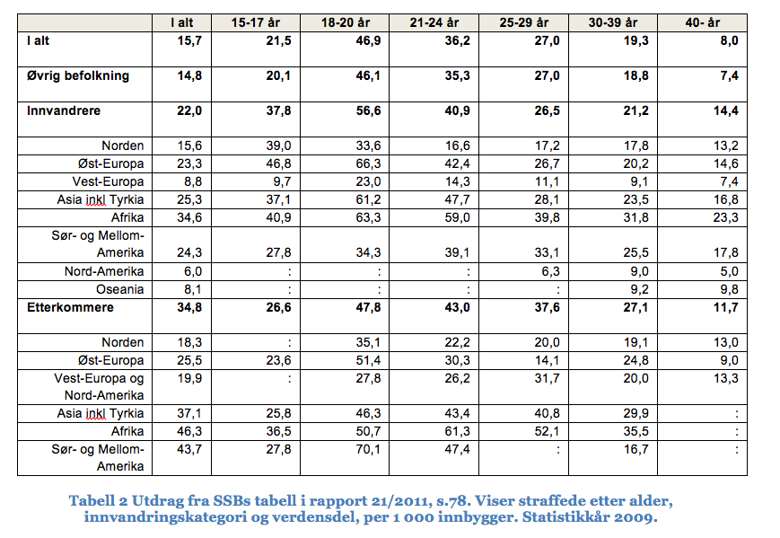 «Personer med to innvandrerforeldre er også vesentlig overrepresentert i kriminalstatistikkene. Dette er imidlertid en nokså liten befolkningsgruppe hvilket gir stor usikkerhet i tallene. Siden om lag 73 prosent er under kriminell lavalder (per 2008), er dette en gruppe som det vil være mer aktuelt å se nærmere på om noen år når flere har passert kriminell lavalder.»