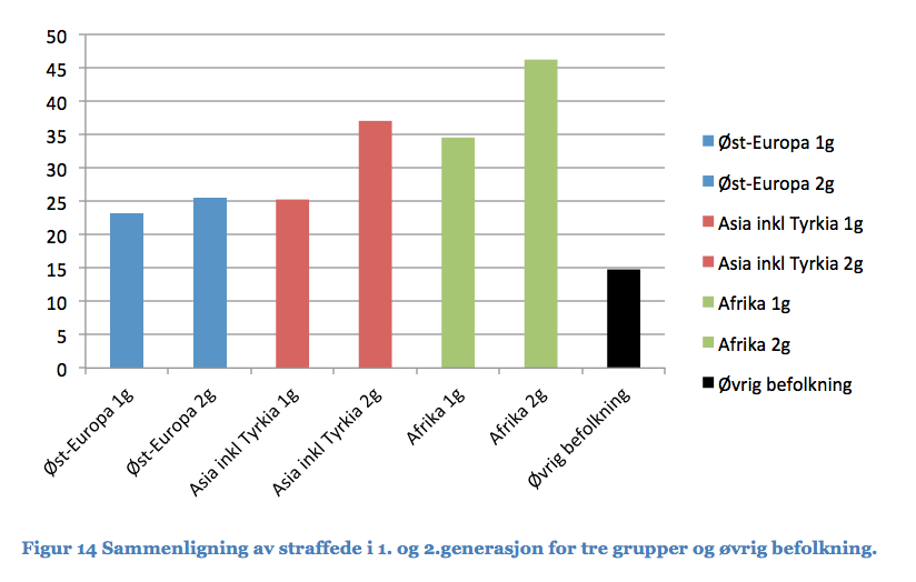 Sammenligner vi de samme tre største gruppene for straffede blant innvandrere (1.generasjon) og etterkommerne (2.generasjon), det vil si Asia inkl. Tyrkia (3 416 i 1.generasjon og 620 i 2.generasjon), Afrika (1 509 i 1.generasjon og 124 i 2.generasjon) og Øst-Europa (2 549 i 1.generasjon og 70 i 2.generasjon), fremkommer det at etterkommerne har høyere kriminalitetsrate enn foreldregenerasjonen, i tillegg til at disse gruppene ligger høyt over øvrig befolkning, jamfør figur under.