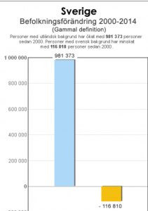 Ekstreme Sverige setter stadig nye rekorder. Ifølge Affes Statistik-blogg vokste innvandrerbefolkningen med nesten en million personer i perioden 2000 – 2014. Samtidig sank den svenske befolkningen med over 100 000 personer.