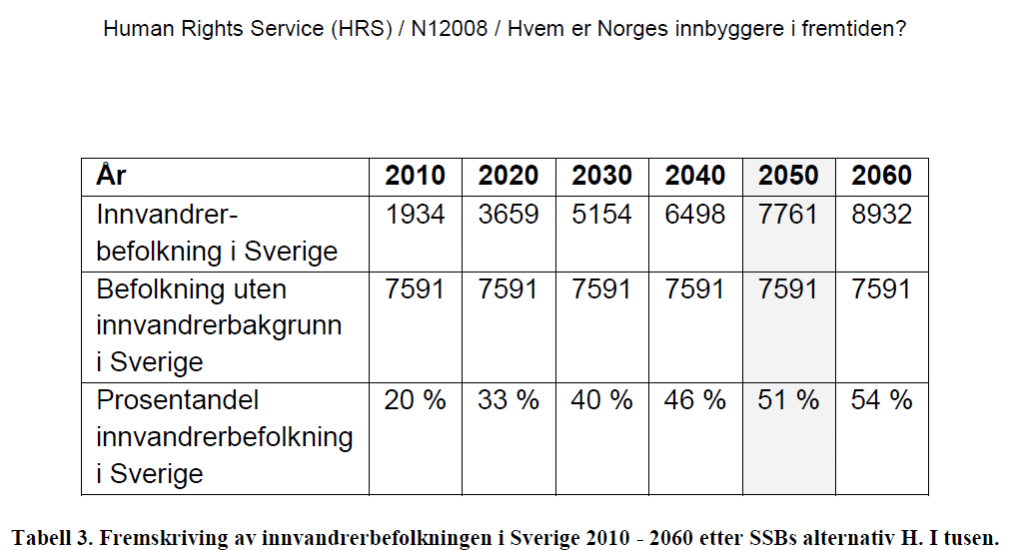 Da HRS utarbeidet rapporten ”Hvem er Norges innbyggere i fremtiden?” i 2008, inkluderte vi også Sverige, nettopp fordi den svenske politikken er i særklasse i vesten. Ved å legge høyalternativet for innvandring til SSB til grunn, ble resultatet at svenskene blir i mindretall i 2049.