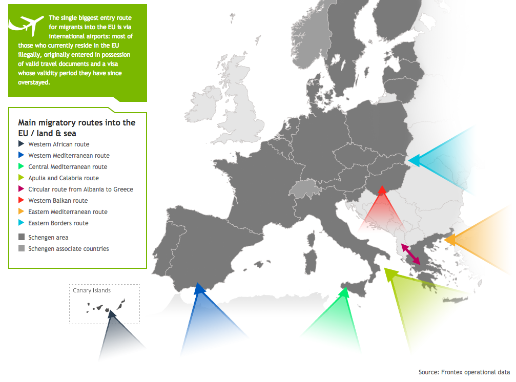 Frontex gir kvartalsvise rapporter om illegale grensekrysninger, presentert samlet, samt presisert på sjø- og landegrenser. De opererer med åtte forskjellige ruter inn til EU/Schengen-området; Western African route, Western Mediterranean route, Central Mediterranean route, Apulia and Calabria route, Circular route from Albania to Greece, Western Balkan route, Eastern Mediterranean route og Eastern Borders route, jmf. faksimile fra Frontex under.