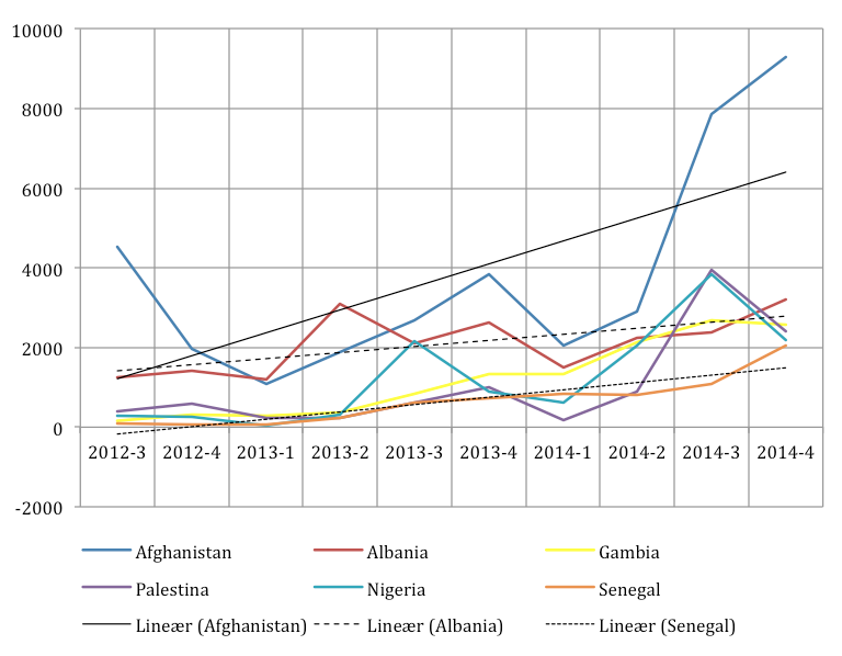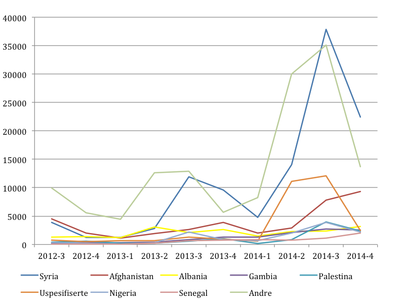 Dette gir også at for Syria, Afghanistan, Albania, Gambia, Palestina, Nigeria, Senegal samt «uspesifiserte» og «andre», kan vi følge utviklingen fra 3.kvartal 2012 til 4.kvartal 2014. Jmf. figur under.