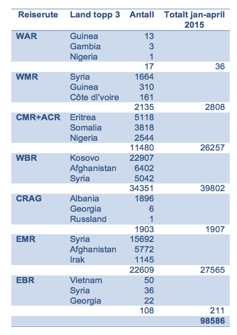 Det kom flest fra Kosovo, 22.907, som forteller at i løpet av årets fire første måneder kom det flere fra Kosovo enn for hele 2014 (22.069). Så vi kan trygt slå fast at Kosovos regjering ikke har truffet med kampanjen, og menneskesmuglerne tjener nok fortsatt gode penger på andres økonomiske nød. Den neste gruppen, syrere, er på omtrent samme størrelse som Kosovo (og kommer via fire ruter), mens afghanere ligger på tredjeplass (12.174).
