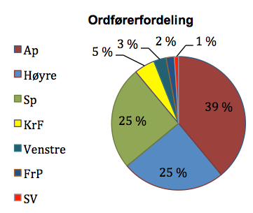 Flertallet av kommunene i undersøkelsen har Ap-, Høyre- eller Sp-ordfører, henholdsvis 39 og 25 prosent for begge sistnevnte. Færrest av kommunene har ordfører fra FrP og SV med henholdsvis 2 og 1 prosent. Se fordeling i figur.