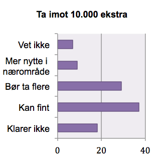 Det interessante er at i et betydelig flertall av disse kommunene sier ordføreren at kommunen kan fint ta imot 10.000 ekstra syriske flyktninger (37 prosent) eller at vi bør ta imot enda flere (29 prosent). Med andre ord mener 66 prosent av ordførerne i 65 prosent av norske kommuner at vi kan ta imot 10.000 ekstra eller flere. Kun 18 prosent sier at kommunene ikke klarer 10.000 ekstra, mens 7 prosent vet ikke.