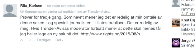 Men nei. Slettet igjen. Dette kommenterte jeg på Facebook og jeg fikk tilsendt en rekke skjermdump av kommentarer fra andre som heller ikke Trønder-Avisas moderator ville slippe gjennom. Samtlige av disse kommentarene henviste til saken på rights.no.