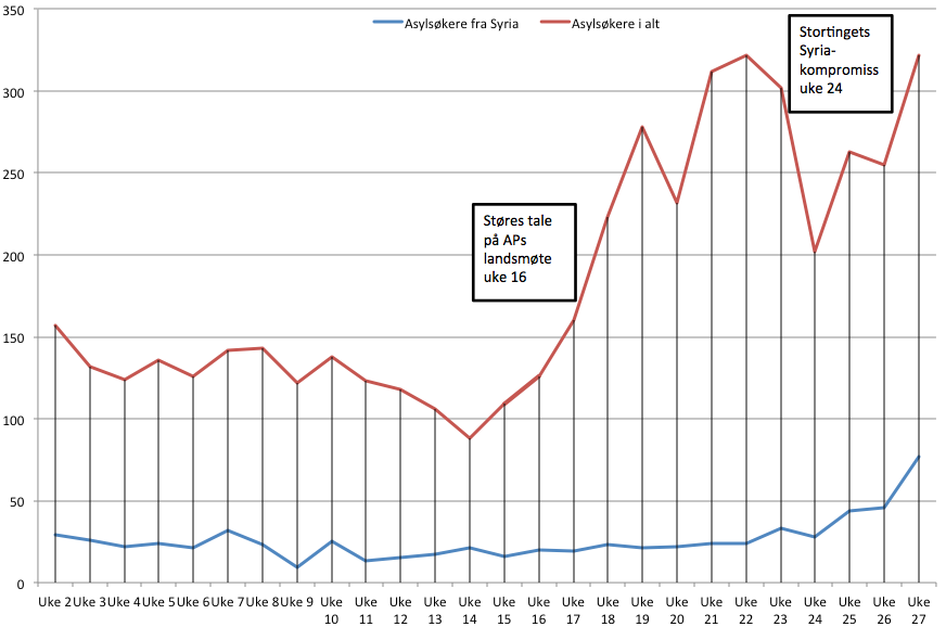 Det kom ni ganger flere asylsøkere sist uke (2.000 versus 221) enn gjennomsnittet per uke i 2014. Det tilsier også at det kom 76 prosent flere asylsøkere sist uke enn antall fødte per uke i 2014 (2.000 asylsøkere versus 1.136 fødte).