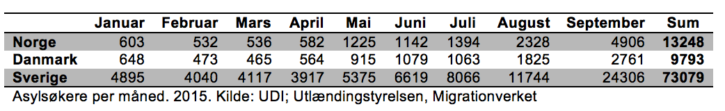 For 2015 har Danmark klart lavere antall asylsøkere enn Norge og selvsagt langt lavere enn Sverige. Sammenligner vi på månedsbasis forteller tallene at det i september kom 2.761 asylsøkere til Danmark, mens det kom 4.906 til Norge. Det gir 77 prosent flere asylsøkere til Norge enn til Danmark for denne måneden. Til Sverige kom det hele 24.306 asylsøkere i september, som er 395 prosent høyere enn til Norge og 703 prosent høyere enn til Danmark.