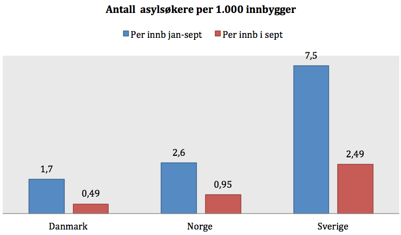 Folketallet per 1. januar 2015 var henholdsvis 5 165 802 i Norge, 5 659 715 i Danmark og 9 747 355 i Sverige. I forhold til folketallet kom det nesten dobbelt så mange asylsøkere per 1.000 innbygger til Norge som til Danmark i september (0,95 versus 0,49). Til Sverige kom det 2,5 ganger flere enn til Norge i september (2,49 vs 0,95). For september kom det 5 ganger flere asylsøkere til Sverige enn til Danmark (2,49 vs 0,49).