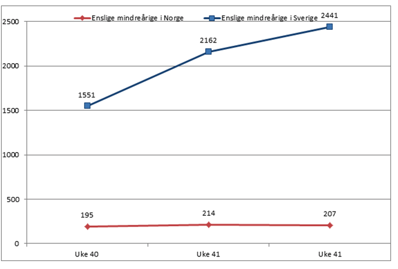 I underkant av 32 prosent av asylsøkerne i Sverige var fra Syria. Samtidig har Sverige fortsatt stor økning av enslige mindreårige asylsøkere (EMA). De økte med 13 prosent i samme periode, til drøyt 2.400. De siste 14 dagene har EMA økt med 57 prosent. 78 prosent av EMA i Sverige er fra Afghanistan, bare 9 prosent fra Syria. Til sammenligning kom det 207 EMA til Norge i forrige uke. Sverige har dermed over ti ganger så mange EMA som Norge, mens de har fem ganger så mange i forhold til folketallet.