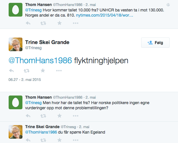 Men om du for eksempel lurer på hvor tallet 10.000 syriske flyktninger kom fra – og som flertallet i Stortinget merkverdig nok stilte seg bak (8.000) – viser Skei Grande seg sitt politiske ansvar bevisst: