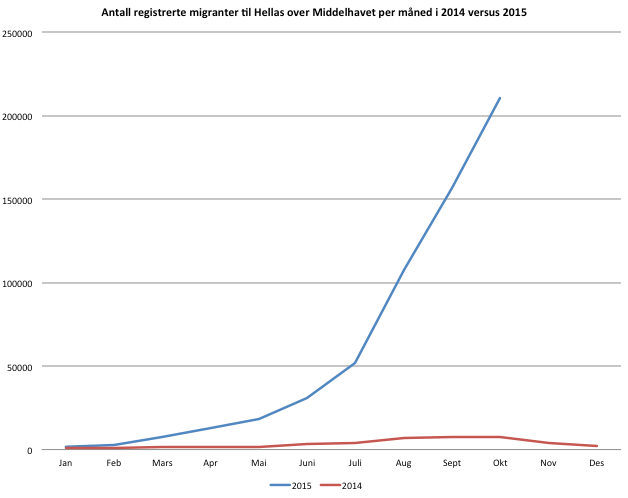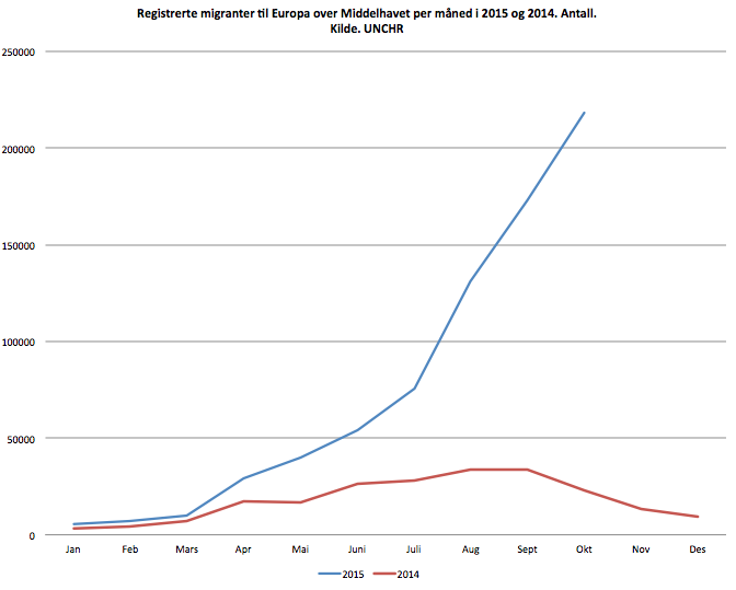 I løpet av oktober kom det over 218.394 migranter, som er opp 26 prosent fra september. Dermed er det nok en suveren månedsrekord. Det kom flere migranter over Middelhavet bare i oktober 2015, enn i hele 2014 (som endte på i overkant av 216.000). Innen utgangen av oktober var det kommet til sammen i overkant av 744.000 registrerte migranter.