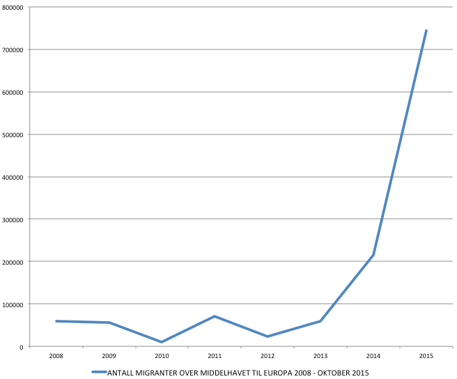 Ser vi på utviklingen de siste årene, fra 2008 til og med oktober 2015, er variasjonene betydelige de første årene, men fra 2014 er økningen er enorm. I 2008 ble det registrert totalt 59.000 migranter, i 2009 lød tallet på 56.252, i 2010 kun 9.654, i 2011 opp til 70.402, så ned til 22.439 i 2012, opp til 59.421 i 2013, så kom det første store inntoget: i 2014 kom 216.054, mens vi ved utgangen av oktober 2015 kan notere oss hele 744.169.