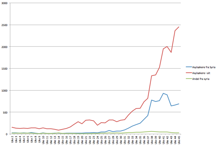 Syrere utgjorde kun 28 prosent av asylsøkerne, mens afghanerne er på topp (37 prosent). Hvis vi holder syrere utenfor kom det 1.760 asylsøkere til Norge siste uke. Det er ni ganger flere enn det totale antall asylsøkere per uke i 2014, noe som gir klare indikasjoner på at vi snakker en folkevandring som i liten grad har med Syriakrigen å gjøre.