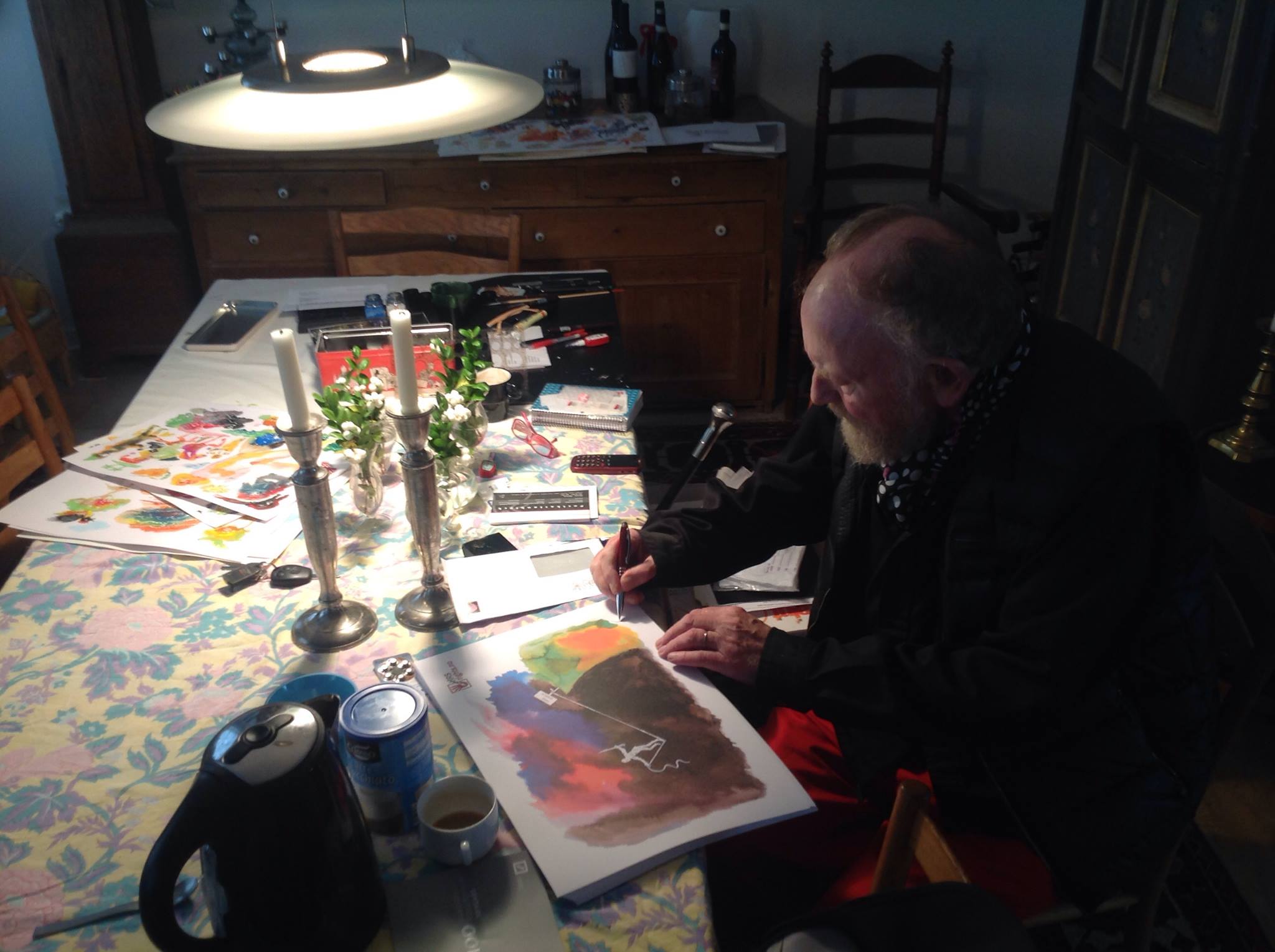Kurt Westergaard, vår helt og frihetsforkjemper, signerer trykkene gitt HRS i gave.