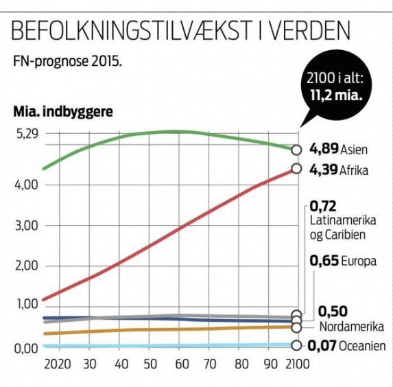 Utviklingen går faktisk raskere enn man trodde. Anslaget er nå at verdens befolkning vil øke til fra dagens 7,3 til 11.2 milliarder i 2100. Afrikas befolkning vil øke til 4,3 milliarder i samme periode. Og dette er FNs Population Division of the Department of Economic and Social Affairs` mellomalternativ – det som vanligvis selges inn som det mest sannsynlige. I Norge har innvandringen som kjent oversteget Statistisk sentralbyrås (SSB) høyalternativ hvert år siden 2005.