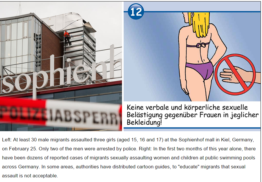 February 14. Two migrants from Iran and Syria assaulted two girls (aged 10 and 11) at a public swimming pool in Dresden. Four migrants assaulted a 19-year-old woman in Duisburg. Migrantsassaulted several women at a discotheque in Mengeringhausen.