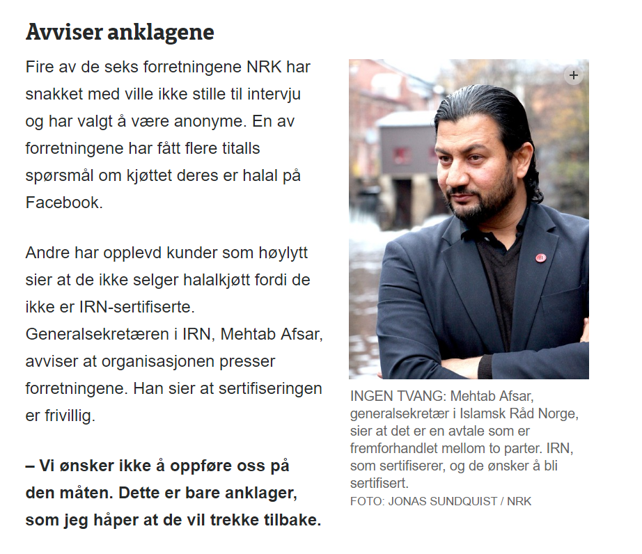 Da Namik takket nei til avtalen opplevde han at flere tvilte på om han solgte halalkjøtt. Disse kundene ble sendt fra IRN, ifølge Namik, og han opplevde det som et press for kjøpe halalsertifiseringen.
