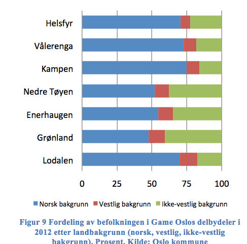 Oslo kommune sin fordeling av innvandrerbefolkningen etter delbydeler viser at i 2013 fikk Oslo sin første bydel (Søndre Nordstrand) der norsk bakgrunn ikke lenger utgjorde flertallet.