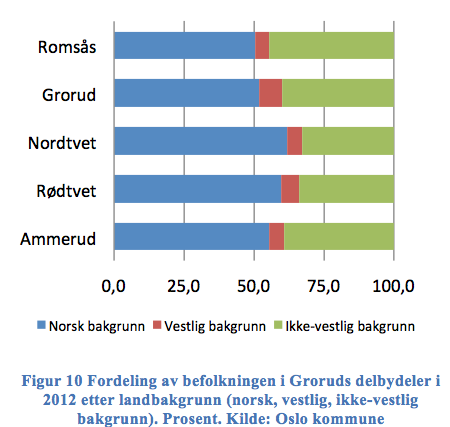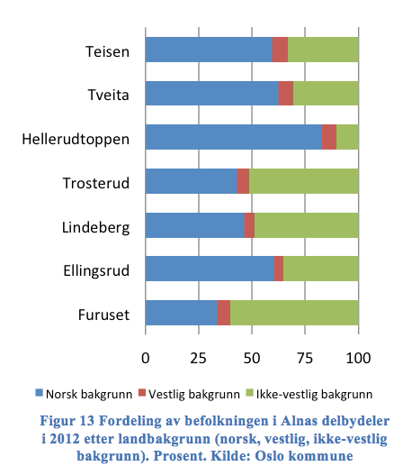 På Furuset utgjorde innvandrerbefolkningen 66,2 prosent, der bare 6 prosent av disse hadde vestlig bakgrunn. På Trosterud utgjorde innvandrerbefolkningen 57 prosent, der vestlige bakgrunn utgjorde 5,5 prosent av disse. På Lindeberg var innvandrerbefolkning på 53,4 prosent, 4,4 prosent hadde vestlig bakgrunn.