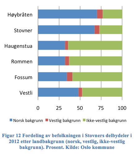I to av delbydelene, Rommen og Haugenstua (begge i bydel Stovner), utgjorde befolkningen med norsk bakgrunn mindre enn en tredjedel.