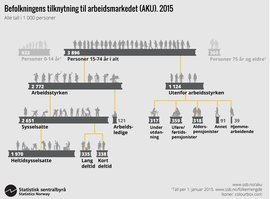 SSBs tall for befolkningens tilknytning til arbeidsmarkedet per 1.januar 2015 viser at antall personer i arbeidsfør alder (hos SSB 15-74 år) var på i underkant av 4 millioner (3 896 000). I underkant av 1 million (932.000) var under 15 år, mens 360.000 var over 75 år.