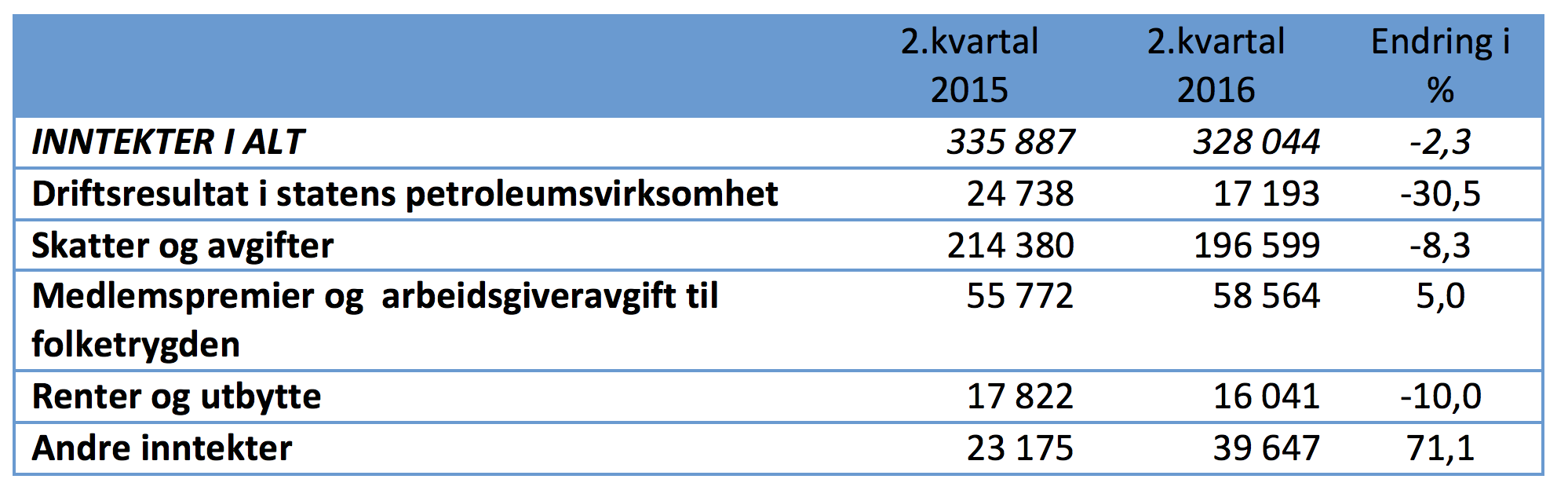 Det er fortsatt lavere inntekter fra petroleumsvirksomheten i form av petroleumsskatter og uttak fra statens direkte økonomiske engasjement (SDØE) som forklarer nedgangen i samlede inntekter. Skatteinntektene fra petroleum er mer enn halvert i dette kvartalet sett i forhold til 2. kvartal 2015, fra 46 milliarder til 23 milliarder. Samlede skatteinntekter i statsregnskapet er redusert med 8,3 prosent.