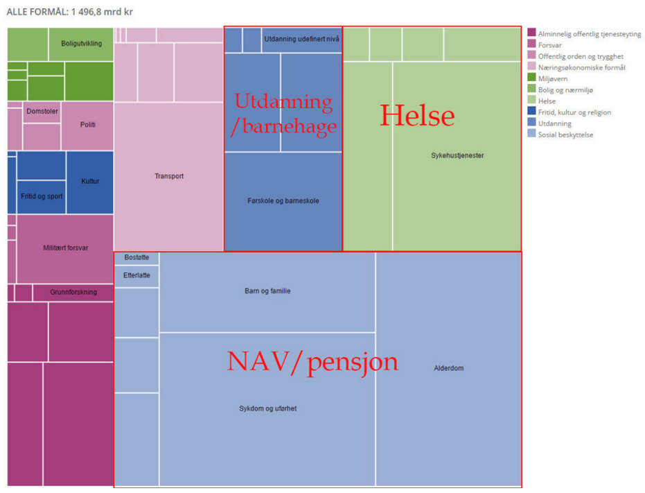 SSB har visualisert statens pengebruk. Her fremkommer det at alle formål utgjør til sammen 1 496,8 mrd i 2015, hvorav 603,5 mrd forvaltes av Nav (40 prosent). Den ser slik ut (her fra Nettavisen):