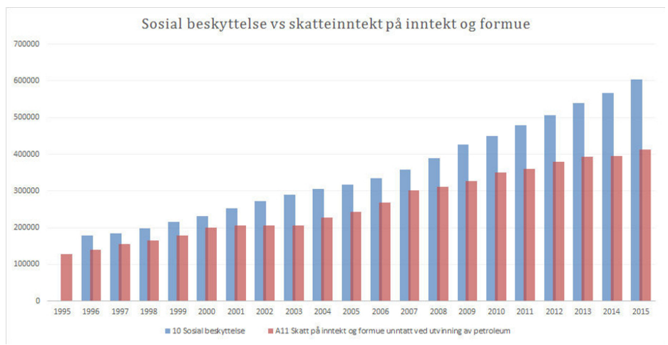 Differansen mellom inntekt og utgifter har de siste årene bare økt. Som Nettavisen viser til dekket skattene fra inntekt og formue på slutten av 1990-tallet 80 prosent av Nav-utbetalinger og pensjoner. I 2015 var denne andelen sunket til 68 prosent. Dette gapet må finansieres.