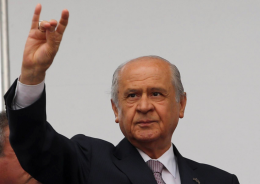 Lederen av nasjonalistpartet, Devlet Bahceli, viser ulvetegnet, det vil si fingrene formes til et ulvehode.