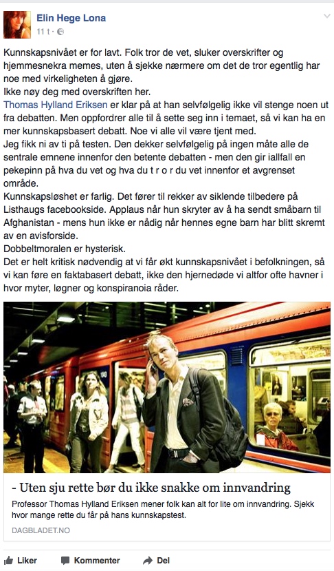 Men det bikker over til besserwisseri når Hylland Eriksen vil bestemme hvem som har nok kunnskaper til å få ytre seg. Er det én ting folk i Norge reagerer på, og det med rette, er det å bli fortalt av en akademiker at de er for dumme til å delta. Desto verre blir det når Hylland Eriksen faller for eget grep: Innvandringsquizen han laget for dagbladet.no denne uka inneholdt en rekke flaue feil. Det er for eksempel ikke 460 000 innvandrere og etterkommere av innvandrere i Norge, men 508 200, og tallet på muslimer er enten høyere eller lavere enn Hylland Eriksens, avhengig av om man teller alle med muslimsk landbakgrunn eller alle som er medlem i et muslimsk trossamfunn.