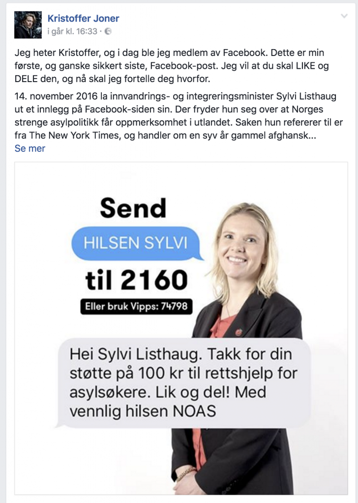 La oss så se litt på hva Kristoffer Joner melder når han tilsynelatende i sin uskyldige vrede, dertil på sin «første, og ganske sikkert siste, Facebook-post«, går løs på statsråd Listhaug.