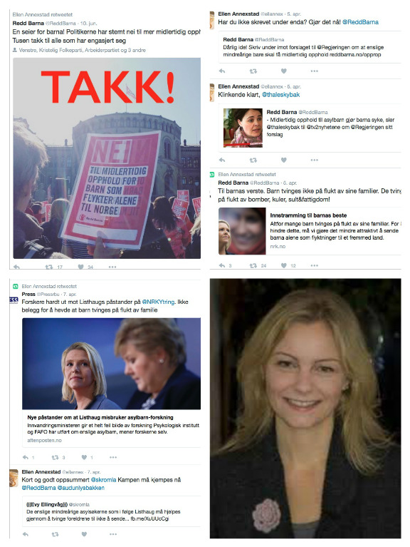 En tredje person som går igjen er Ellen Annexstad (bildet). Hun er Barnelegeforeningens representant i Legeforeningens utvalg for menneskerettigheter, klima og global helse – som Margit Steinholt leder. I januar var hun medforfatter av nok et kritisk innlegg – sammen med Svein Aarseth. En kikk på Twitter etterlater liten tvil om Annexstads asylpolitiske synspunkter.