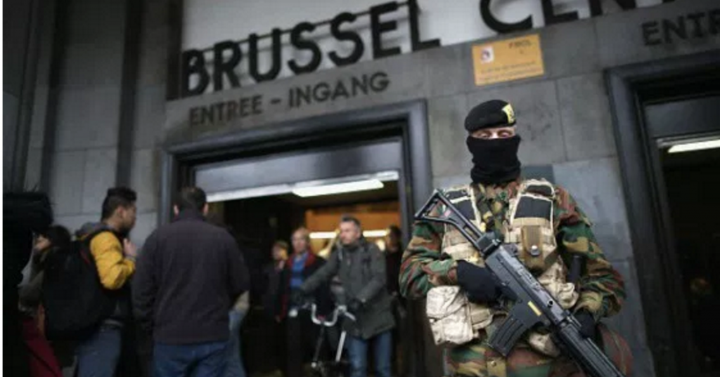 Publikum ved jernbanestasjonen i Brussel voktes med automatvåpen.