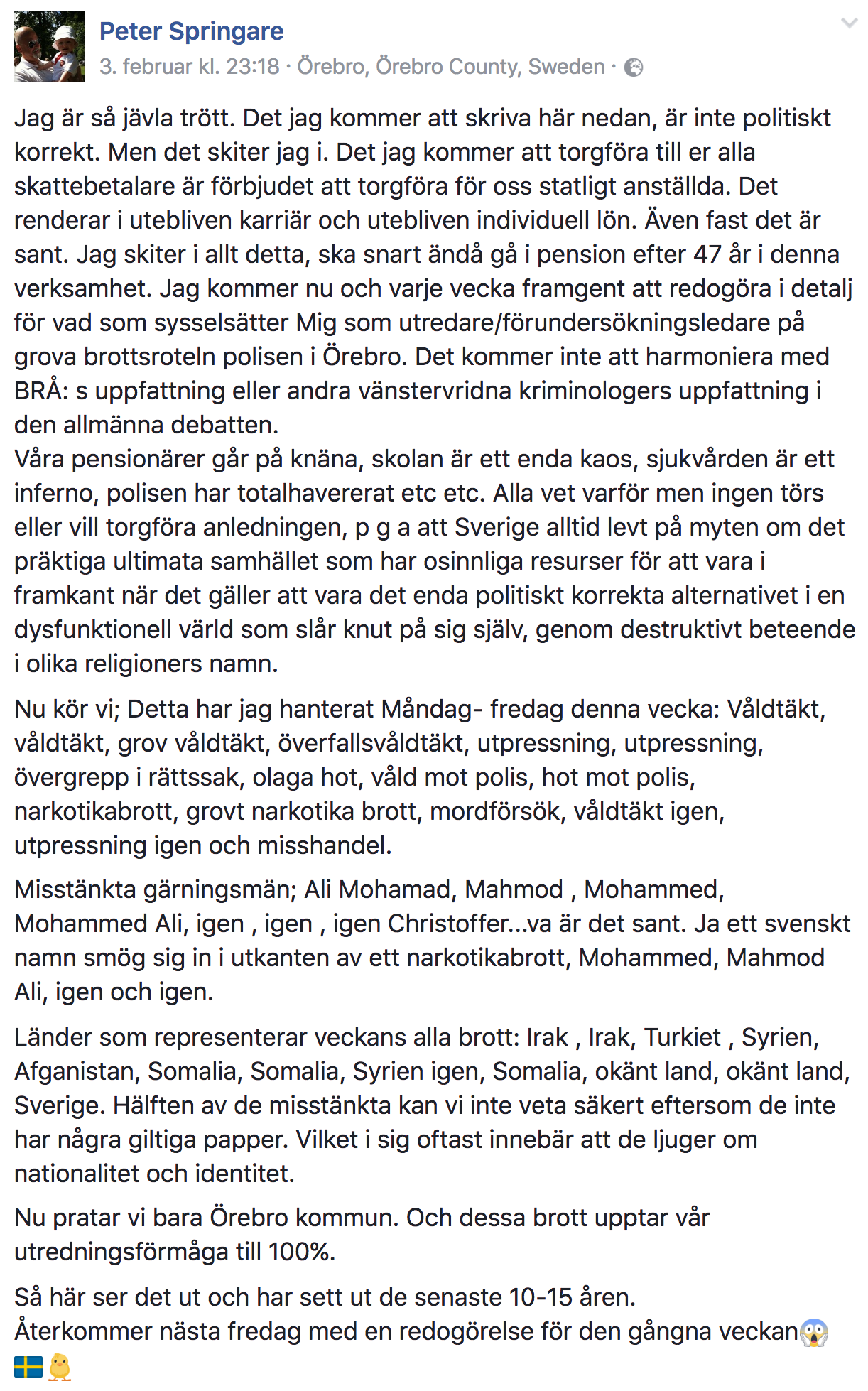Nei, Peter Springare er ingen nyutdannet spirrevipp med overdrevne ambisjoner. Sveriges Radio omtaler han som Örebropolitets mest «erfarna brottsutredare» der omtalen handler om at FB-innlegget førte til at Springare er anmeldt – av sine egne.