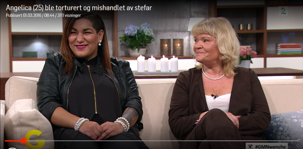 Helsekomiteens Kari Kjønnes Kjos og Angelica på TV2, der de forteller om sitt nære forhold. Kjos har «adoptert» Angelica, og jeg tror nok ikke det er å overdrive at dette langt på vei reddet Angelica – sammen med hennes egen formidable innsats for å bli et helt menneske igjen.
