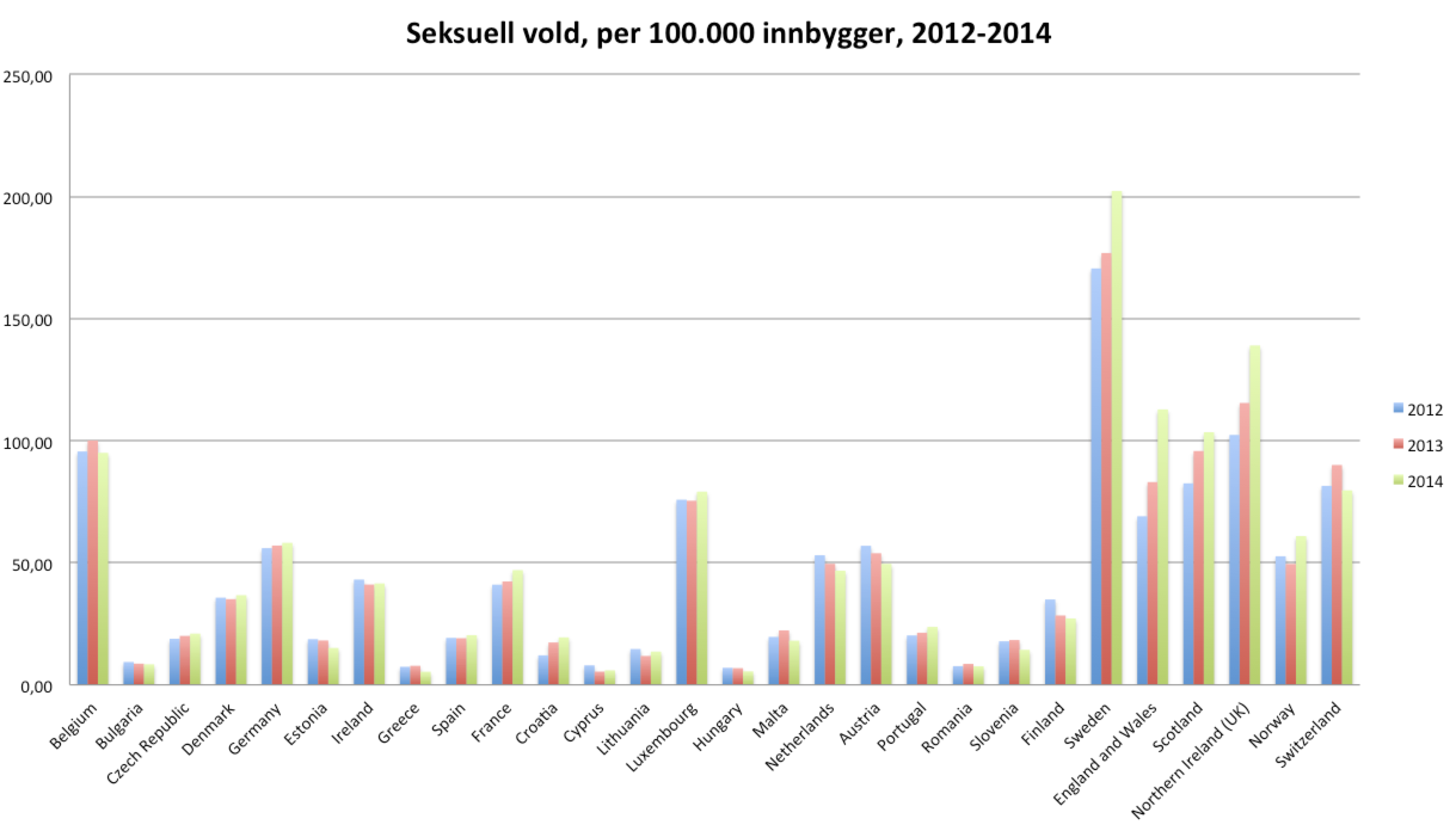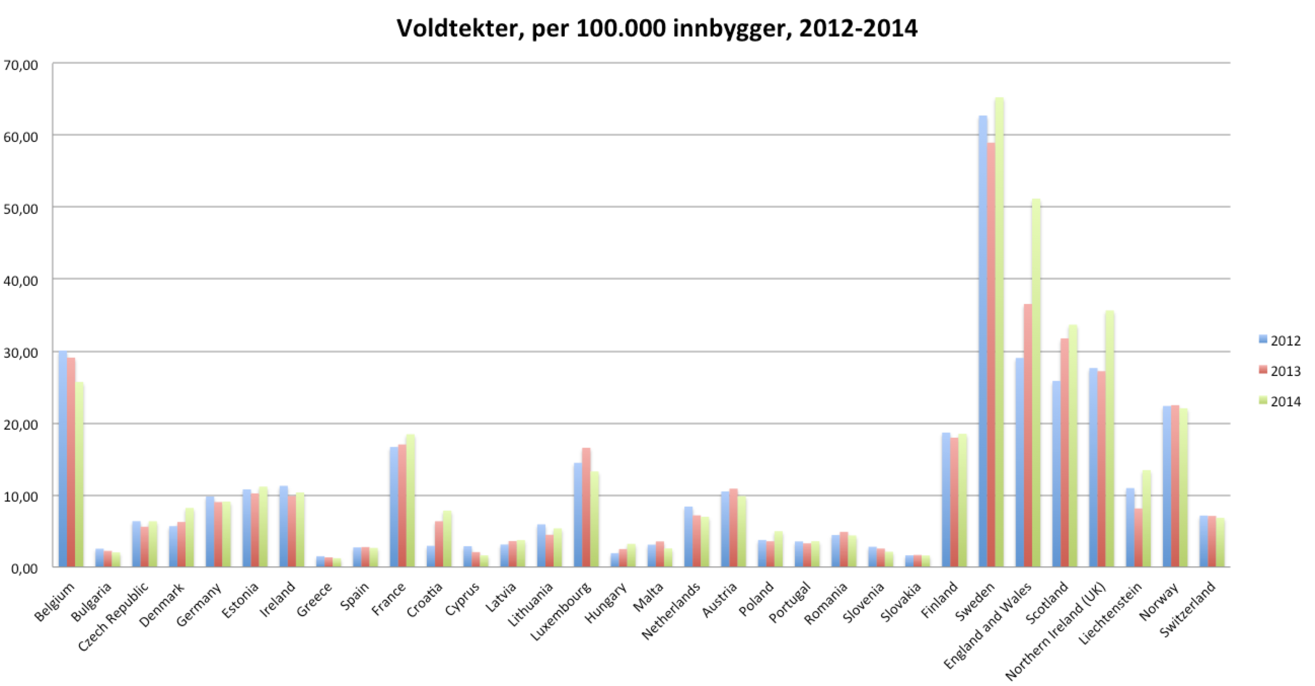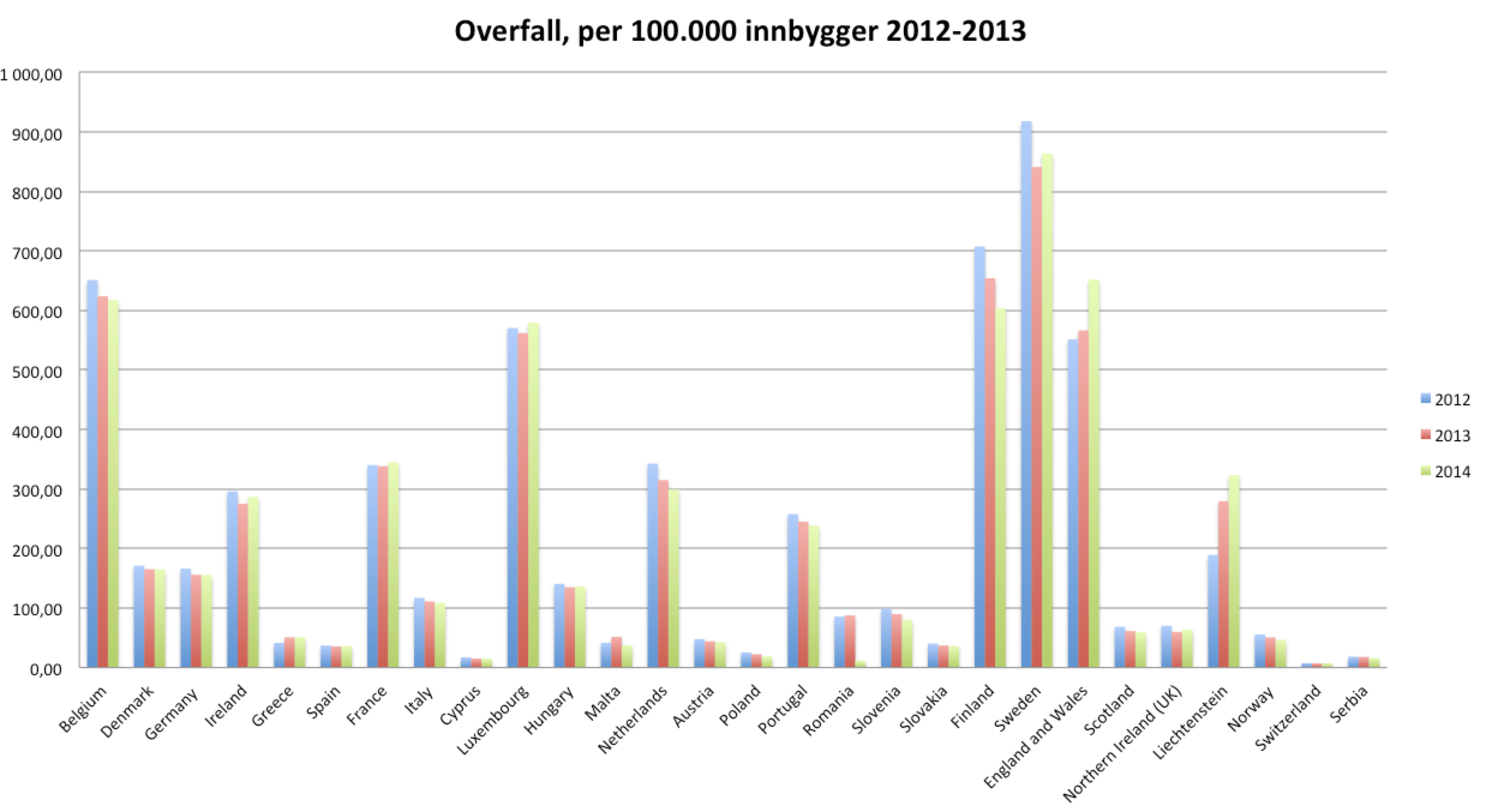 Hvis man tar seg en tur innom Eurostat bekreftes kronikkforfatternes oppfatning av kriminalitetsbilde i Sverige. Hva gjelder overfall for perioden 2012 til og med 2014 (som er siste tall fra Eurostat på denne kategorien) troner Sverige på toppen over en rekke utvalgte land (dataene er rapportert inn til Eurostat via politiets data i de respektive land).
