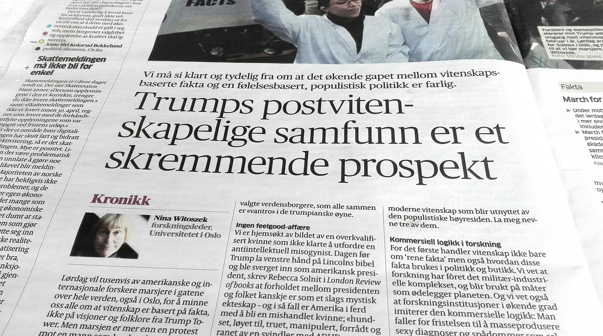 Tittel: Trumps postvitenskapelige samfunn er et skremmende prosjekt. Skribent: Nina Witoszek (forskningsleder Oslo Universitet)