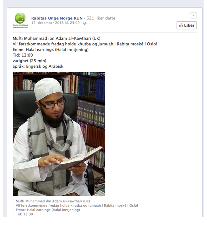 Brorskapets norske moské, Rabitamoskeen, inviterte Mohammad ibn Adam al Kawthari på besøk. Denne fundamentalistiske predikanten driver bl.a. Jameah Girls´ Academy i Leicester, en av flere omstridte islamskoler i Storbritannia.