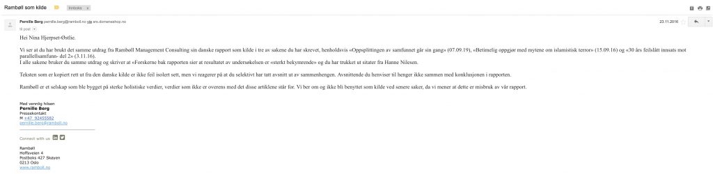 Det likte den norske avdelingen av Rambøll dårlig og 23. november 2016 ramlet det inn en e-post fra Rambølls pressekontakt Pernille Berg. Her het det at jeg misbrukte forskningsrapporten [alle uthevelser i e-postene er mine. Min anm.]: