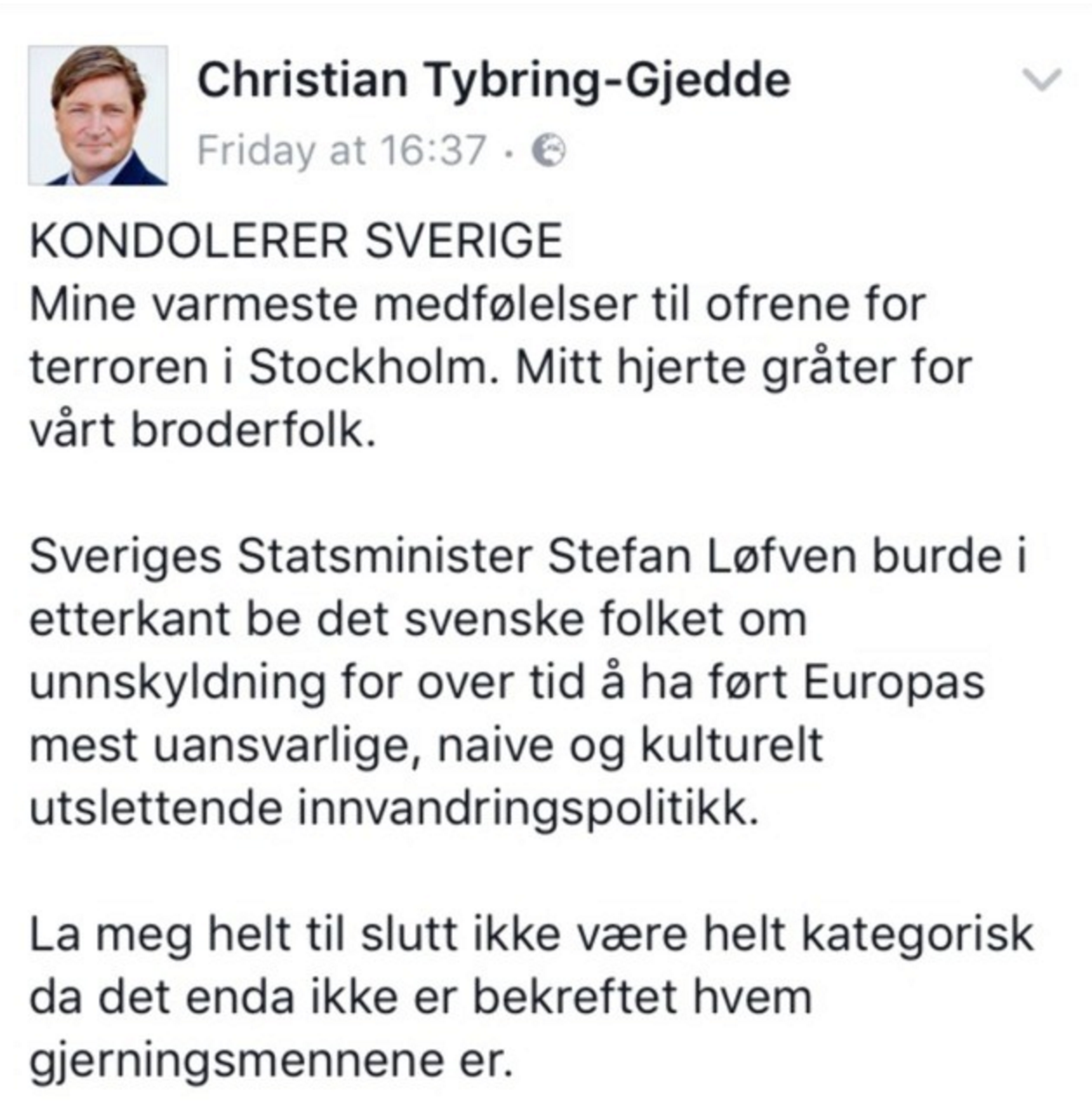 Så følger – mer forutsigbart – skjermdumper fra Facebookprofilen til FrPs Christian Tybring-Gjedde og Kent Andersen. Siden Tybring-Gjedde er den mest kjente av dem, var nok den samme Stein skuffet over at han ikke nevnte islam med et ord. Det «grusomste» Tybring-Gjedde gjør er å si at Sveriges statsminister burde be det svenske folket om unnskyldning for å «ha ført Europas mest uansvarlige, naive og kulturelt utslettende innvandringspolitikk».