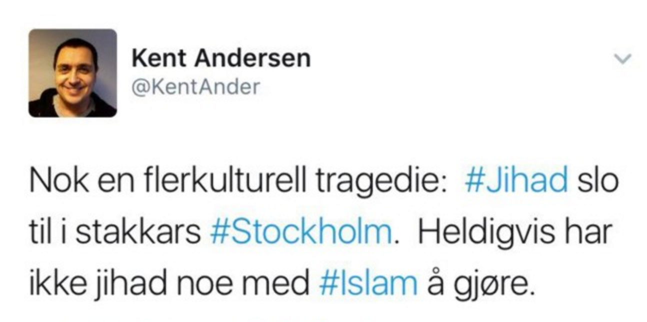 Siden Stein ikke fikk stygg næring nok hos Tybring Gjedde, så var det bare å koble inn Kent Andersen. Han slo nemlig fast at Stockholm-terroren var jihadisme – og påpekte det som mediene over tid har prøvd å fortelle oss: At det ikke har noe med islam å gjøre. Men han fikk ikke noe klapp på skulderen for det. Som er like greit, da det er like smart som å fortelle oss at koranen ikke har noe med islam å gjøre.