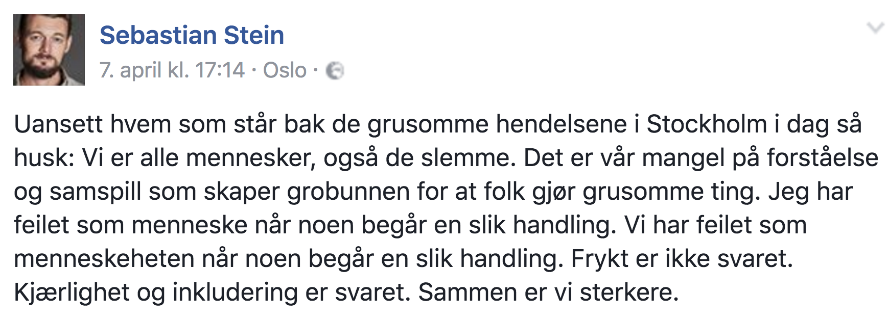 Kjente samfunnsdebattanter og politikere kastet seg forutsigbart over tastaturet for å slå politisk mynt på andres lidelse. Terroren i Sverige var en god anledning, syntes de, til å skjødesløst kritisere islam og innvandrings- og asylpolitikk.
