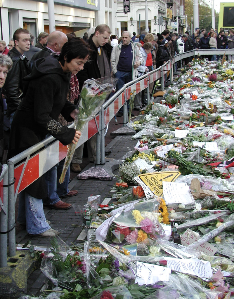 Europa mistet dyden i 2004 da Theo van Gogh ble strupeskjært på åpen gate i Amsterdam, med en lapp festet til brystet – med en kniv – om at Ayaan Hirsi Ali var den neste på listen. Her legger Hege ned blomster i blomsterhavet som – den gang – sjokkerte nederlendere lot vokse. Siden har det bare blitt flere blomsterhav rundt om i Europa.