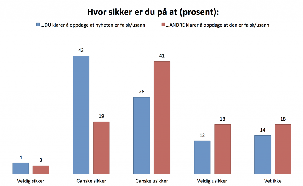 47 prosent er veldig eller ganske sikker på at de selv klarer å oppdage at nyhetene er falsk/usann, men bare 22 prosent tror at andre evner å oppdage det samme. 28 prosent tilkjennegir at det er ganske usikker på om de selv ville avdekket falske/usanne nyheter, men desto mer usikker på andre: 41 prosent. Det kanskje mest oppsiktsvekkende er likevel at så få er veldig sikker på at de ville avdekket falske/usanne nyheter og at, igjen, vet ikke-kategorien er høy.