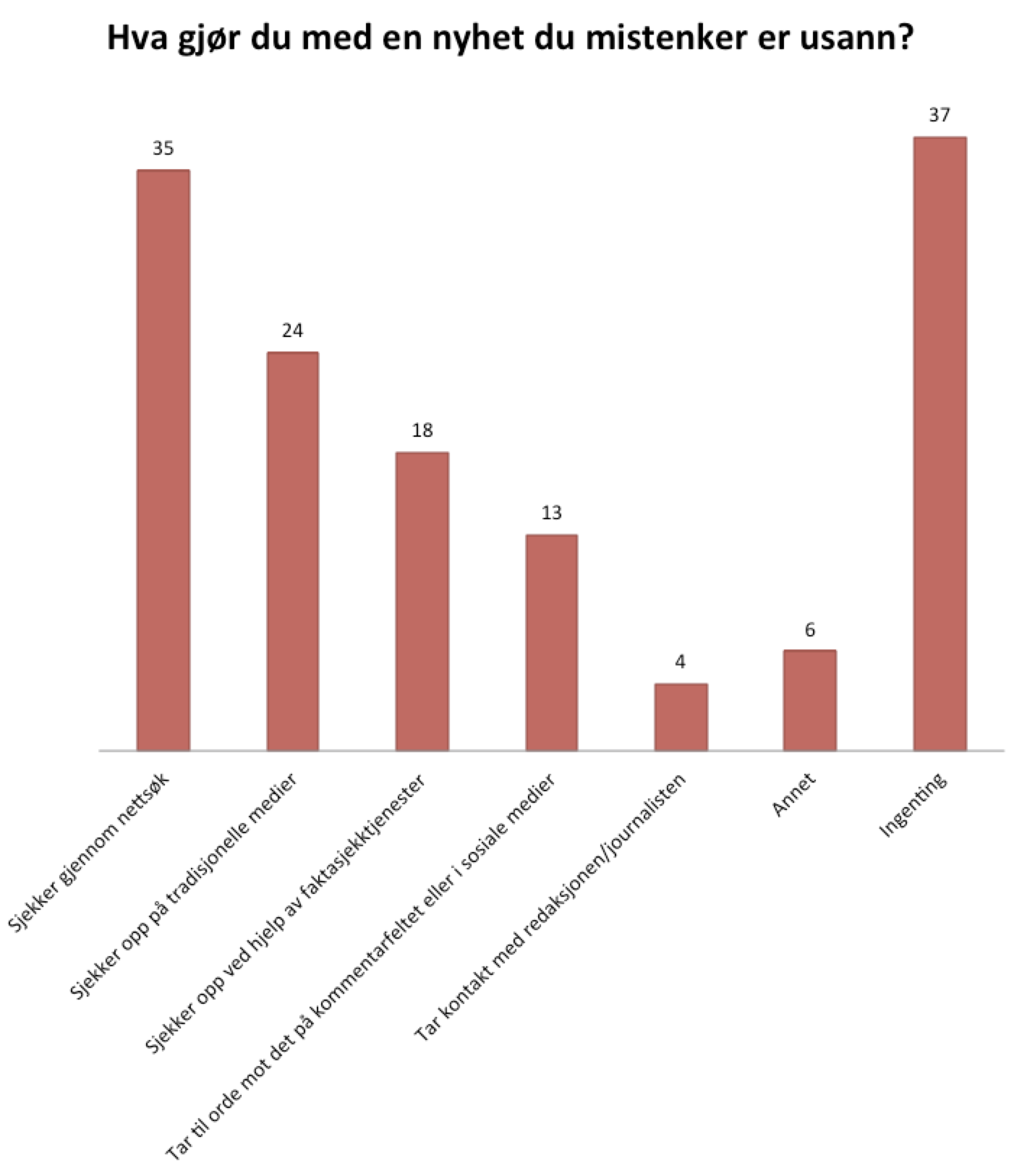 55 prosent sier at de daglig eller ukentlig ser nyhetsartikler eller nyhetsinnslag som ikke oppleves som sanne, mens 45 prosent tror dette er artikler som er bevisst usanne. Sistnevnte er en meget høy andel. 35 prosent mener at de daglig leser noe som de tror er usant (20 prosent) eller bevisst usant (15 prosent).