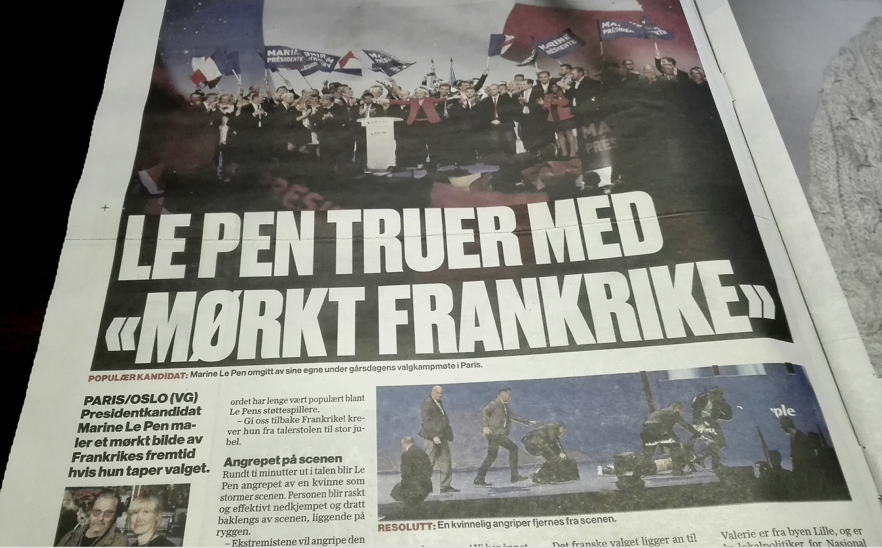 Det gikk hardt for seg når en venstreekstremist entret scenen på en av Marine Le Pens første valgkampmøter i Paris. Den aggressive dama ble dratt av scenen etter at hun prøvde angripe Le Pen.