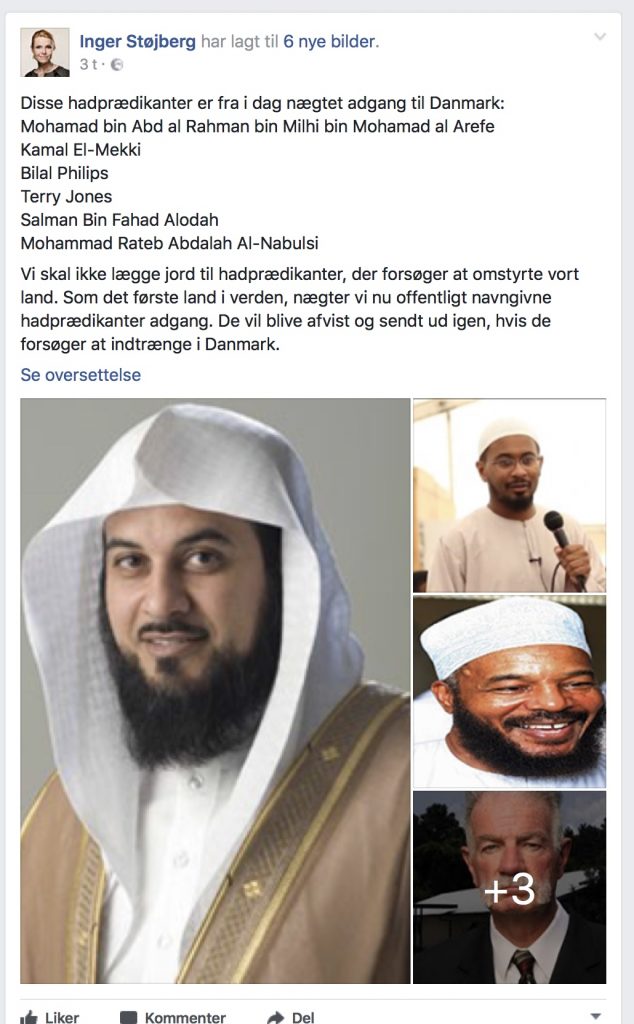»Regeringen vil ikke acceptere, at hadprædikanter kommer til Danmark for at prædike had mod det danske samfund og for at indoktrinere andre til blandt andet at begå vold mod kvinder og børn, udbrede ideer om et kalifat og i det hele taget undergrave vores grundlæggende værdier. Derfor er jeg selvfølgelig også meget tilfreds med, at det nu bliver tydeligt for enhver, at disse personer ikke er velkomne i Danmark,« siger hun i pressemeddelelsen.