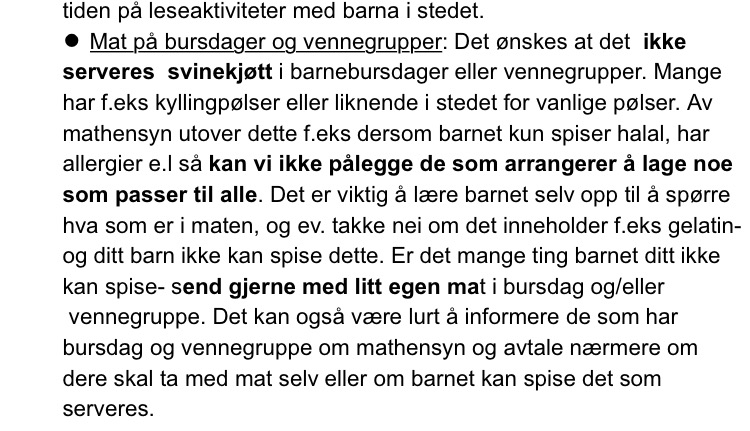 Skolens ledelse er helnorsk, og blant de mange titalls ansatte er det ikke en eneste hijab å skue, ei heller «imam-skjegg». Ettersom dette foregår i en middelstor by, er det selvsagt også en moské i byen. Forelderen kan fortelle at en sentral leder i moskeen selv tok turen inn på et privat kjøkken for å sjekke om pølsene barna skulle få var halal, altså kyllingpølser. Hans barn deltok nemlig i bursdagen.
